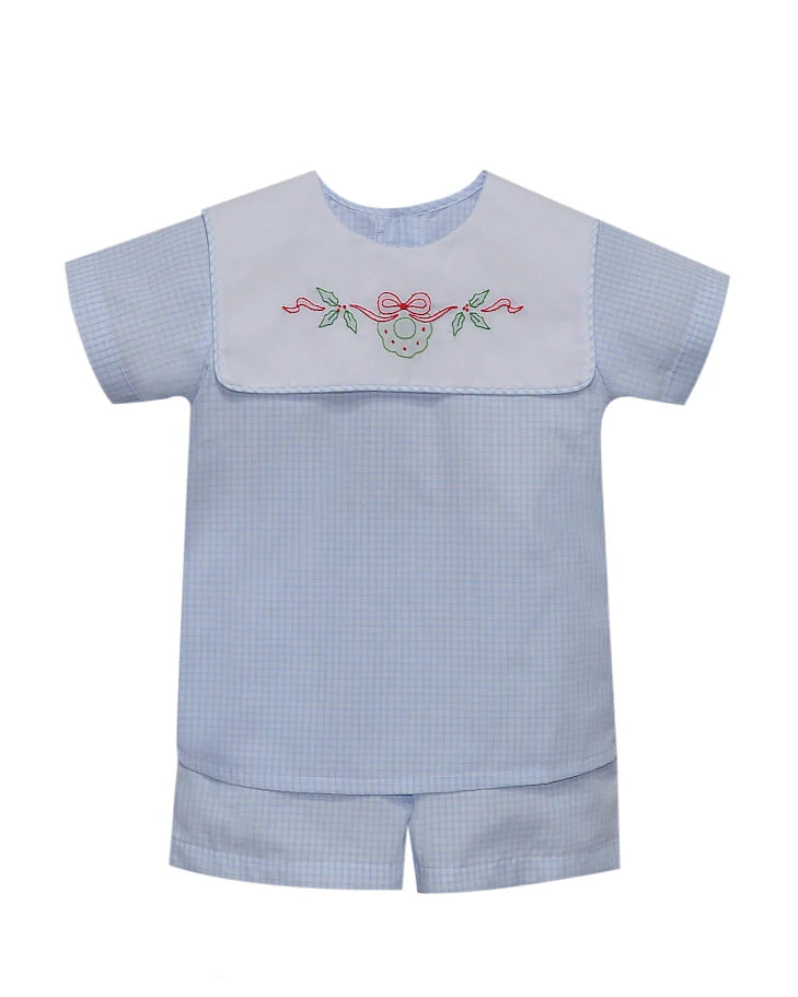 Classic light blue gingham set featuring a crisp white yoke with festive embroiled wreath and red bow detail. This outfit is timeless, comfortable, and perfect for Christmas gatherings, church, or holiday photos!
