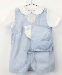 A true masterpiece for your little gentleman’s wardrobe. This exquisite three-piece set features a pale blue, high-waisted romper with elegant side-button tabs and a crisp white Peter Pan collar shirt with delicate blue piping. Topped off with a matching sun bonnet, it’s the quintessential outfit for christenings, weddings, or his very first Sunday service.